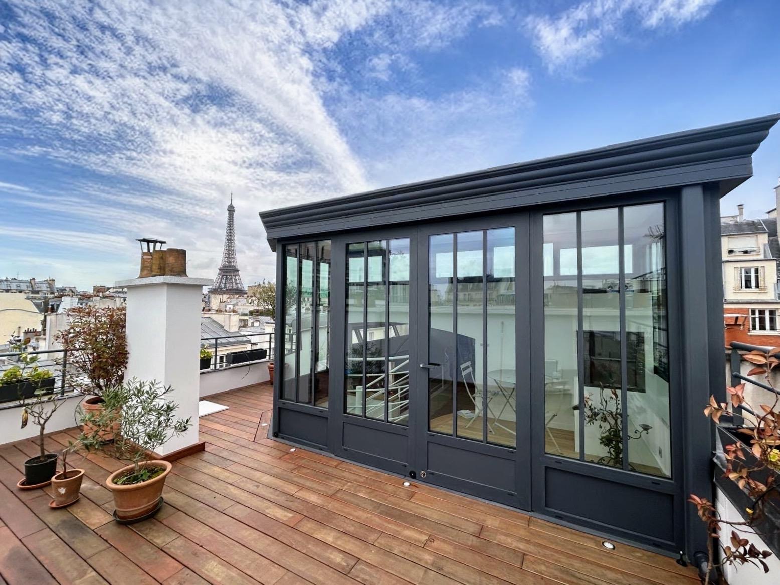 Structure légère et performante, parfaitement adaptée aux contraintes techniques des terrasses d’immeuble, offrant confort, isolation et vue panoramique.